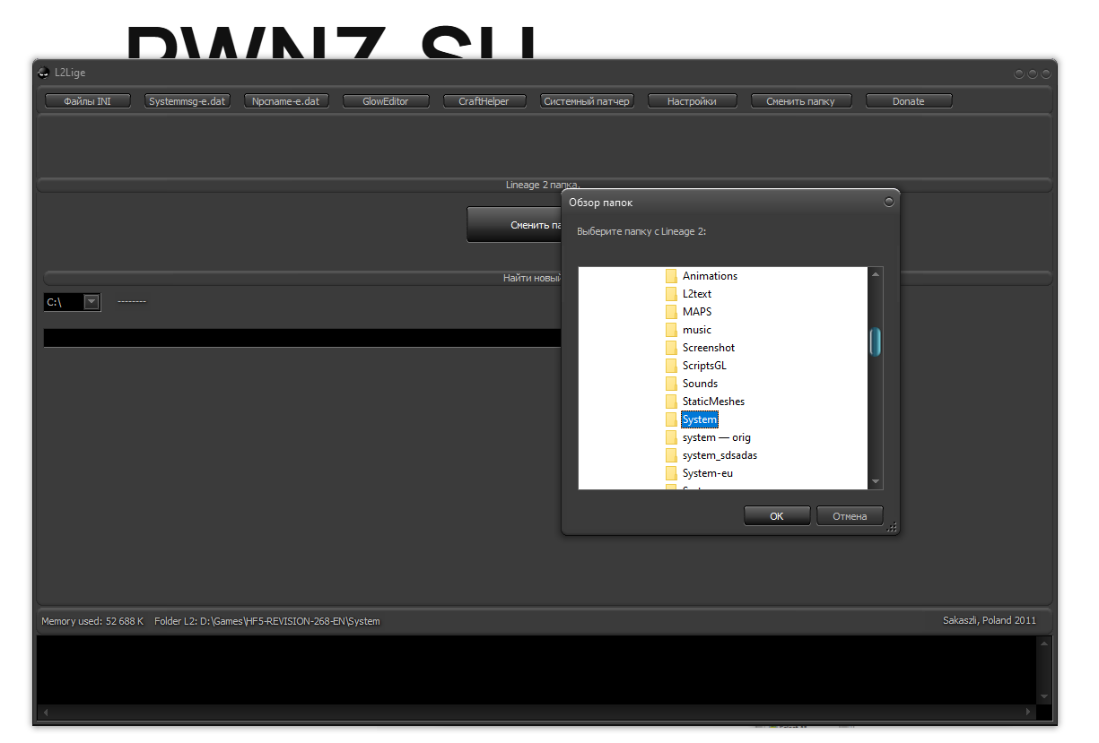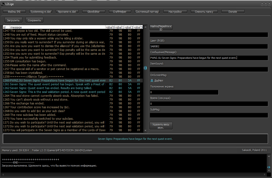 Перед началом использования запускаем и выбираем «Сменить папку», выбираем system папку клиента, открываем нужную вкладку, например Systemmsg-e.dat — загрузить.